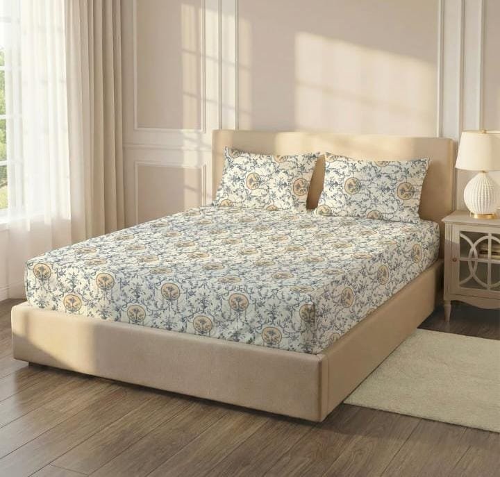 Bedsheet, beige bedsheet, blue bedsheet, elegant bedding, floral print bedsheet, premium bedsheet, printed bedsheet