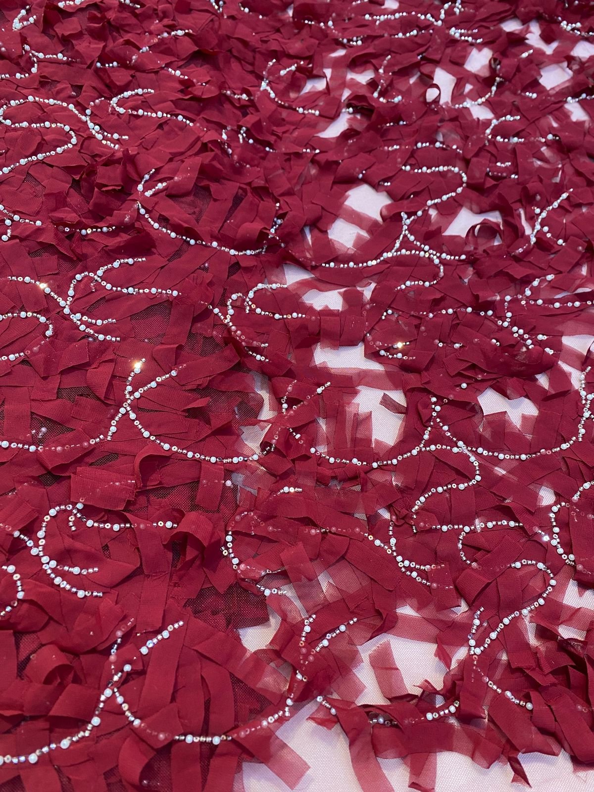Elegant maroon net fabric designed with decorative ribbons and pearl bead work.